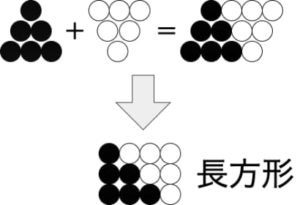 図の例「 3 番目の三角数 6 」で証明すると、縦が 3 (つ) 横が 4 (つ)の長方形になるので、3 × 4 = 12 と合計数が求まり、これを 2 で割り 12 ÷ 2 = 6 と求められます。
